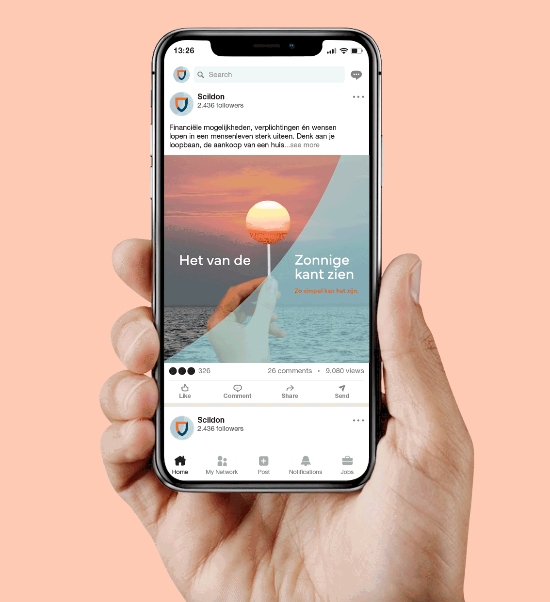 Scildon spreekt in hun nieuwe missie de ambitie uit om een betekenisvolle bijdrage te leveren aan een duurzamere toekomst. Dit hebben wij gevisualiseerd door middel van het uitvergrote schild van Scildon. De opwaartse lijn die wordt gebruikt in de verschillende ontwerpen als stijlelement bekrachtigt de waarden groei en positiviteit. Het verfrissende kleurenpalet en de nieuwe fontkeuze bevestigen de menselijke aanpak.