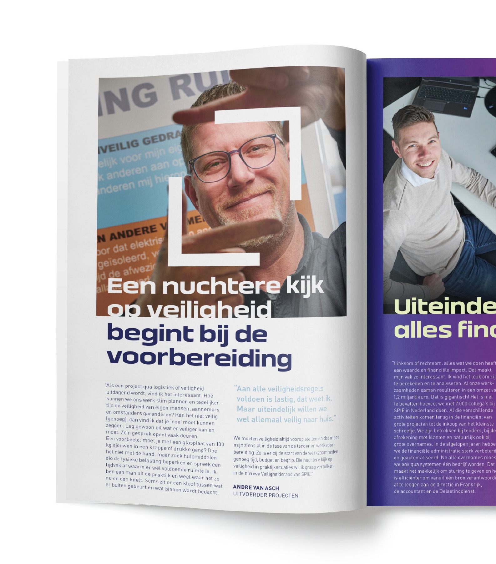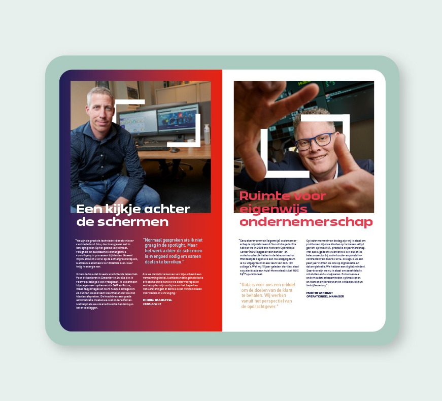 ‘Ingelijst’ in vierkante beelden, en her en der een frame makend met de handen, komen we de medewerkers en hun verhalen tegen. Zij delen persoonlijke ervaringen op bijvoorbeeld visie, toekomstperspectief en ambities binnen de groep. Als je SPIE beter wil leren kennen, kijk dan naar deze vrolijke gezichten en hun verhalen, die de drijvende kracht vormen achter deze organisatie.